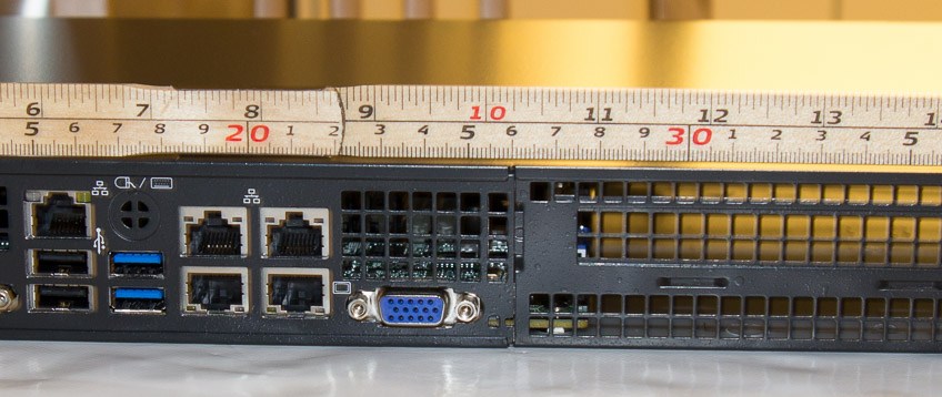 As I was also interested in a Xeon E3v5 virtualization server, and would prefer it to be quarter-depth as well, I was a little disappointed that Super Micro didn’t have any mini-ITX mainboards for that platform. Nextron helpfully suggested that they could check if the Super Micro X11SSL-F mainboard (micro-ATX) would fit when building my firewall, as they had it on hand. It has the dimensions 24.4cm by 24.4 cm (9.6″ by 9.6″). I was not expecting it to fit as the depth of the mainboard was a mere 5 mm (0.2″) less than the chassis.